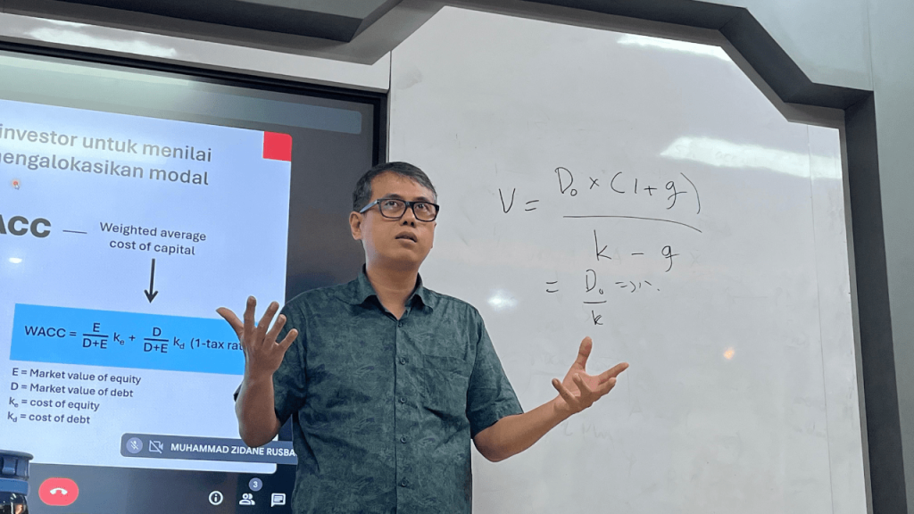 On this occasion, Parahita explained the theory and practice of corporate valuation to the students. According to Parahita, Although external factors heavily influence a company’s ultimate value, strategic capital management and business innovation can enhance this value. As a general guideline, companies should always try to keep Return on Invested Capital (ROICC) higher than the Weighted Average Cost of Capital (WACC).